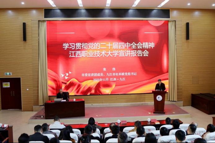 报告会上,张伟围绕深刻认识党的二十届四中全会的重大意义,准确把握“十五五”时期在基本实现社会主义现代化进程中的重要地位,全面阐释“十五五”时期经济社会发展的指导方针、主要目标、战略任务和重大举措,深刻把握坚持和加强党的全面领导根本要求,结合九江市情和职业教育未来发展趋势,对全会精神进行了深入解读,对新发展理念在九江的实践进行了重点阐述。他强调,要把学习贯彻全会精神与学习领会习近平新时代中国特色社会主义思想贯通起来,深刻领会其核心要义、精神实质和实践要求,全面落实立德树人根本任务,坚持德技并修育人机制,紧密对接江西“1269”行动计划与九江“9610”产业发展布局,发挥人才聚集、智力密集与特色专业优势,为九江高标准高质量建设长江经济带重要节点城市贡献新的力量。