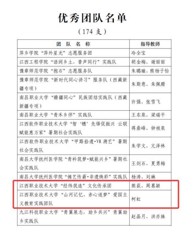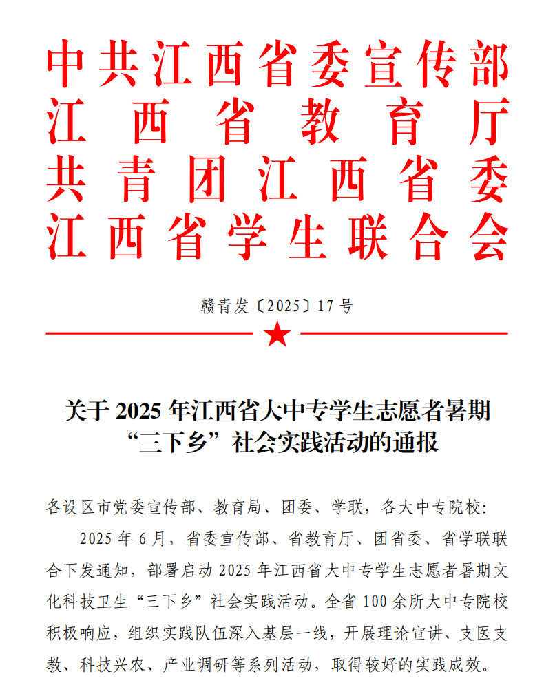 本网讯(校团委)近日,中共江西省委宣传部、江西省教育厅、共青团江西省委、江西省学生联合会联合印发了《关于2025年江西省大中专学生志愿者暑期“三下乡”社会实践活动的通报》,我校喜获“优秀单位”“优秀团队”“优秀个人”等6项荣誉,充分彰显了学校实践育人工作的良好成效与青年学子的使命担当。